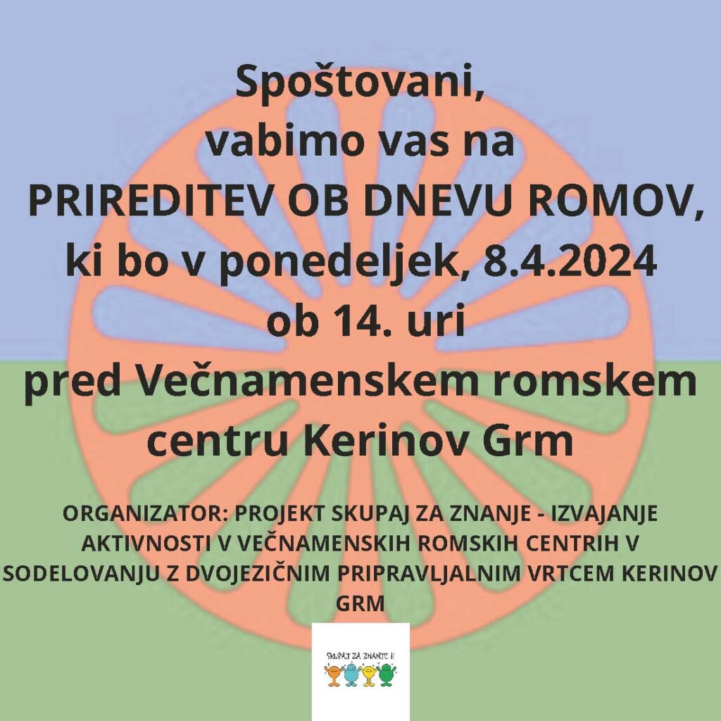 Vabljeni na prireditev ob svetovnem dnevu Romov, ki bo v ponedeljek, 8. aprila 2024, ob 14. uri, pred Večnamenskim romskim centrom Kerinov Grm.